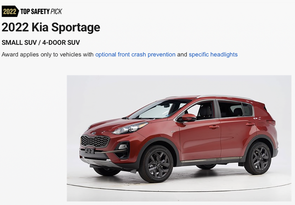 Актуальную награду Top Safety Pick от Страхового института дорожной безопасности IIHS автомобиль получил в 2021 году. Во всех испытаниях, в том числе при фронтальном ударе с перекрытием 25%, автомобиль показал хороший уровень безопасности. Хуже всего был результат при боковом ударе: этот тест Киа Спортейдж прошла удовлетворительно. Стоит отметить, что это испытание прошел на «отлично» только один автомобиль — Мазда CX-5.
