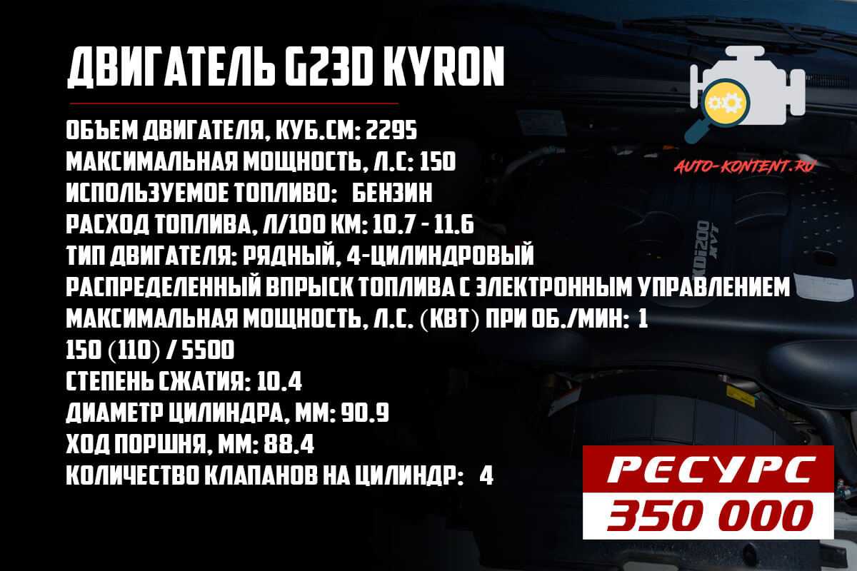 - G23D Kyron – 2.3-литровый бензиновый силовой агрегат, производящий 214 Нм крутящего момента и выдающий 150 «лошадок»;