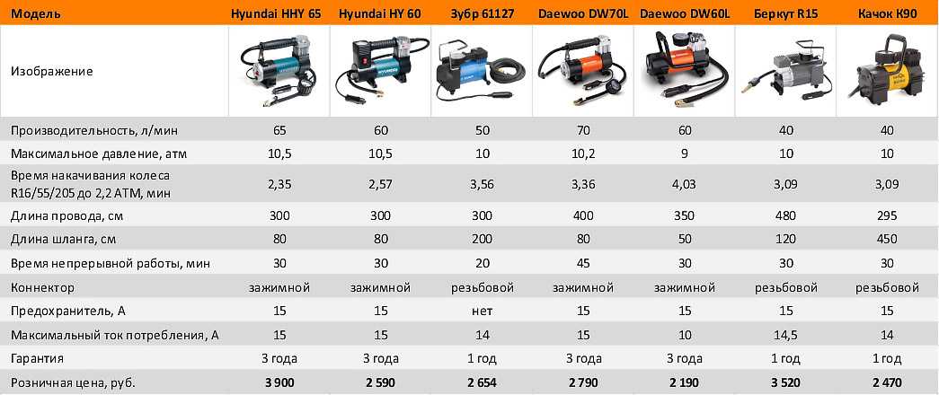 - Допустимая продолжительность работы без перерывов. Важный параметр при накачке колес в грузовых машинах, где понадобится большое количество времени.