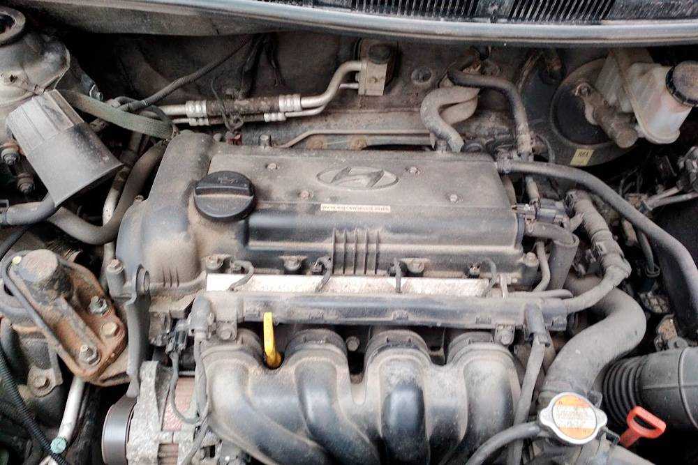 Это подкапотное пространство моего Соляриса. Довольно пыльно, зато видно, что нигде ничего не течет. Щупы для проверки масла: желтый — масло в двигателе, красный — масло в АКПП