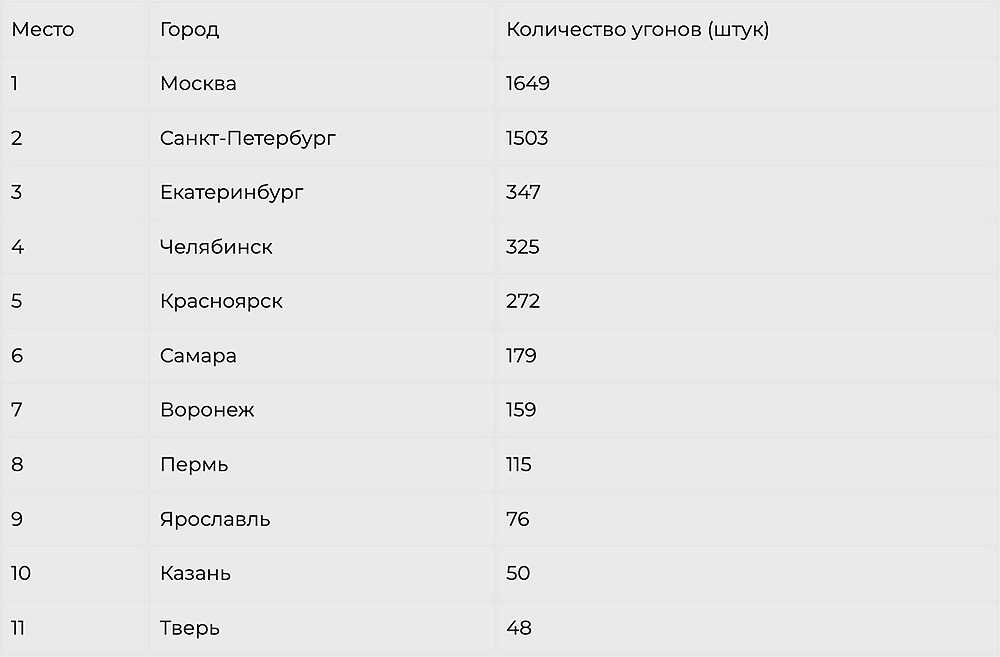 Угон — это проблема, которая касается разных городов России. Ниже приведён топ городов по угонам в 2023 году: