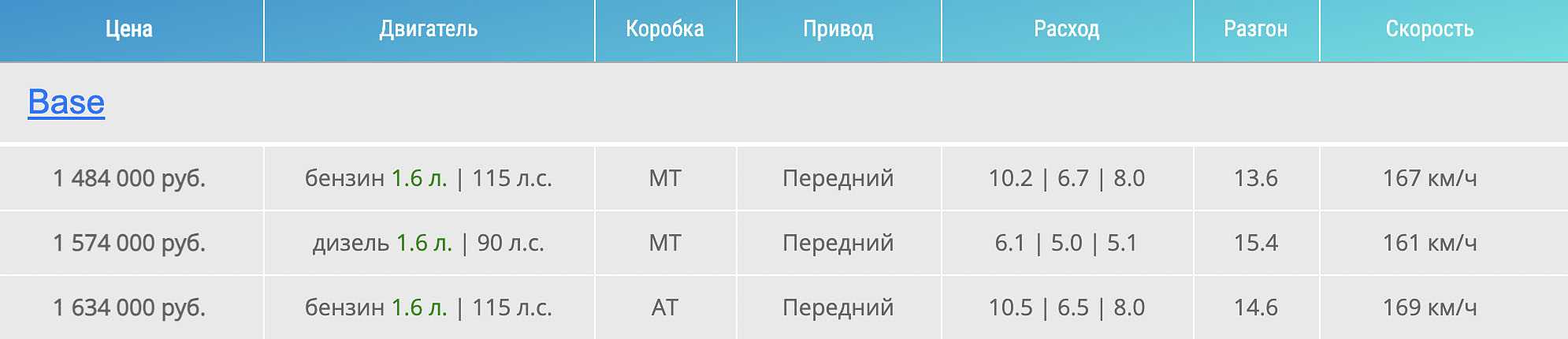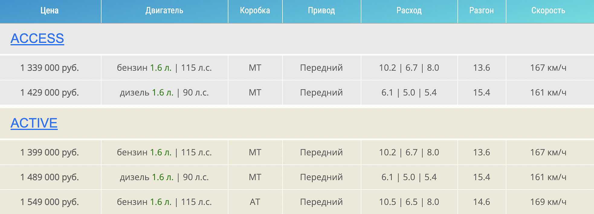 - Access с дизелем. Начальная цена от 1,429 миллиона рублей. Также идёт исключительно с 5МКПП.