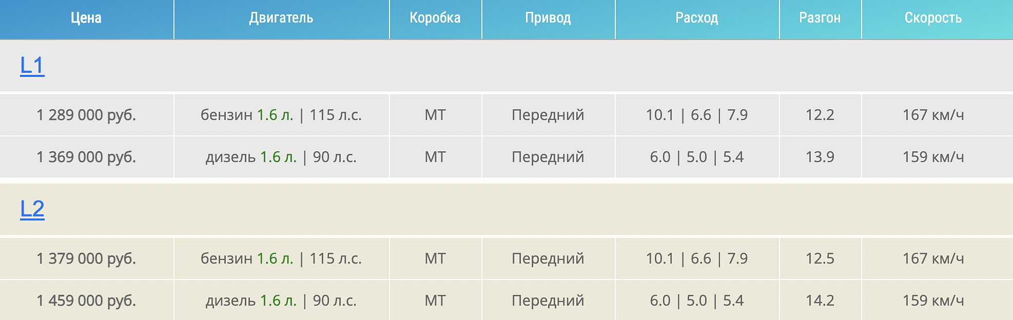 - Life с дизельным ДВС и МКПП. Стартует эта версия от 1,574 миллиона рублей.